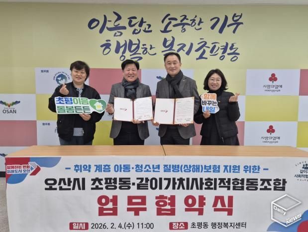 e데일리뉴스 | 오산시 초평동 행정복지센터는 지난 4일 지역 내 차상위계층 청소년과 아동의 건강한 성장 지원과 의료비 부담 완화를 위해 같이가치사회적협동조합과 질병(상해)보험료 지원을 위한 업무협약을 체결했다고 밝혔다.