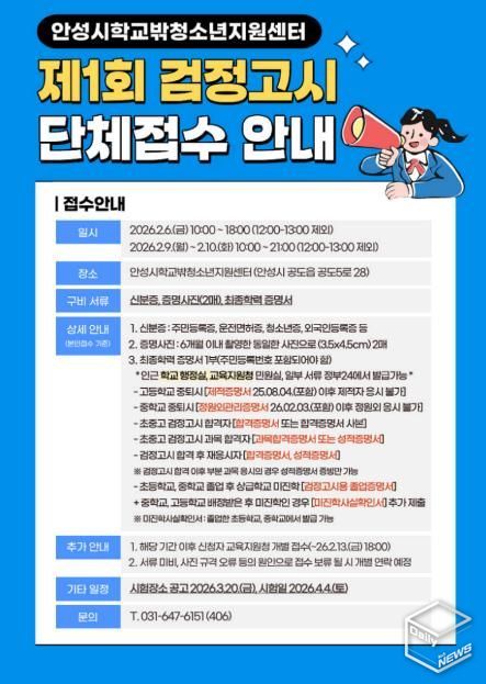e데일리뉴스 | 안성시학교밖청소년지원센터는 오는 4월 4일 시행되는 2026년도 제1회 검정고시와 관련하여 단체원서접수를 진행한다고 밝혔다.