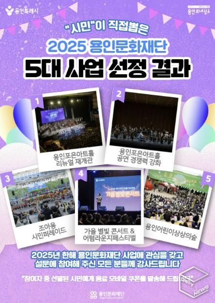 e데일리뉴스 | 용인문화재단은 시민 참여 온라인 투표를 통해 ‘시민이 선정한 2025년 용인문화재단 5대 사업’을 발표했다.