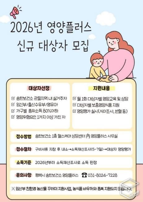송탄보건소 관계자는 “임산부와 영유아는 성장과 건강에 있어서 영양 관리가 매우 중요한 시기”라며 “영양플러스 사업을 통해 생애주기별 건강한 식습관 형성을 위한 맞춤 지원을 아끼지 않겠다”고 밝혔다.