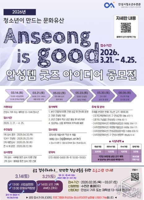 e데일리뉴스 | 안성시청소년수련관은 청소년이 지역 문화유산을 창의적인 굿즈로 재해석하는 '2026 청소년이 만드는 문화유산 ‘안성템 굿즈 아이디어 공모전’'을 개최하고, 오는 3월부터 참가 청소년을 모집한다고 밝혔다.
