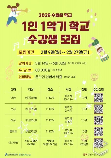 e데일리뉴스 | 수원문화재단이 오는 27일까지 시민 누구나 참여할 수 있는 ‘2026 수원은학교 1인 1악기 학교’ 수강생을 선착순으로 모집한다.