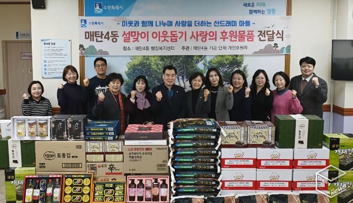e데일리뉴스 | 영통구 매탄4동 행정복지센터는 지난 10일, 설 명절을 앞두고 지역 내 어려운 이웃들을 위한 ‘설맞이 사랑의 후원물품 전달식’을 개최하며 지역사회에 따뜻한 정을 나눴다.