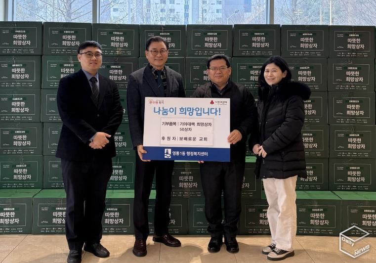 e데일리뉴스 | 수원특례시 영통구 영통1동은 지난 10일 보배로운 교회가 설 명절을 맞아 관내 어려운 이웃에게 전달해달라며 ‘기아대책 희망상자(생활필수품 키트)’ 50박스를 영통1동 행정복지센터에 기탁했다고 밝혔다.