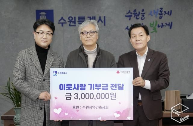 이웃돕기성금 300만 원은 수원지역건축사회 회원 137명이 모금해 마련했다. 수원지역건축사회는 2024년에도 이웃돕기성금 300만 원을 기부한 바 있다.