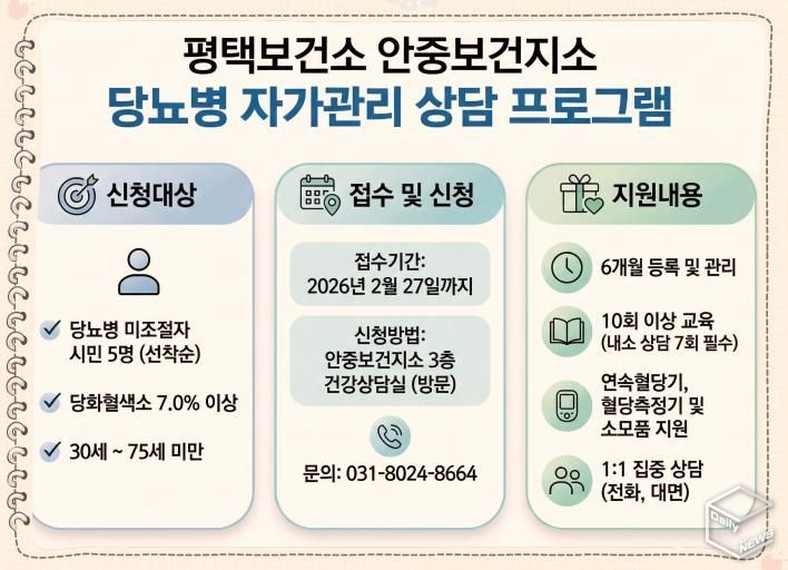 모집 대상은 30세 이상 75세 미만의 당뇨병 미조절자(당화혈색소 7.0% 이상)이며, 선정 기준에 해당하지 않더라도 집중 관리가 필요하다고 판단되면 대상자로 포함될 수 있다. 모집 인원은 총 5명으로, 소규모 맞춤형으로 운영된다. 참여를 희망하는 시민은 2월 27일까지 안중보건지소 만성질환팀으로 방문해 신청하면 된다.