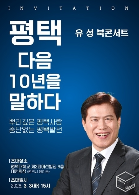 e데일리뉴스 | [평택=강경숙 기자] 오는 3월 3일(화) 오후 3시, 평택대학교 제2피어선빌딩 6층 대연회장에서 유성 前평택시장 후보의 저서 「사랑하는 평택에서, 좋은 이웃들과 품격 있게 살고 싶다」 출간 기념 북콘서트가 열린다.