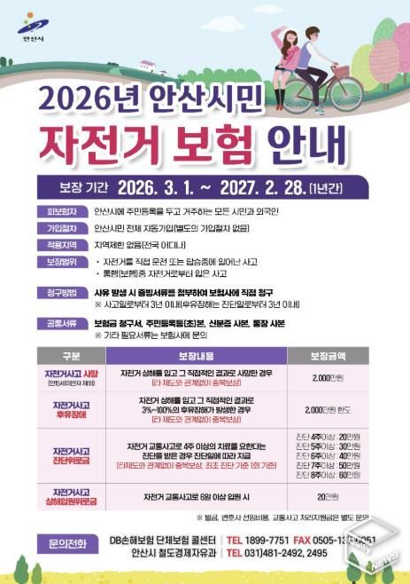 이민근 안산시장은 “시민들이 안심하고 자전거를 이용할 수 있도록 매년 자전거 보험에 가입해 안전하고 편리한 이용 환경을 조성하고 있다”며 “성숙한 자전거 문화 정착을 위해 시민 여러분께서도 적극 동참해 주시길 당부드린다”고 말했다.