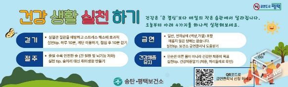 e데일리뉴스 | 평택시 송탄보건소는 시민을 대상으로 걷기(신체 활동)·금연·절주·건강 체중 유지로 구성된 ‘4가지 건강생활습관 실천’ 수칙을 안내하며, 일상에서 작은 습관부터 실천해 건강을 지켜나갈 것을 당부했다.
