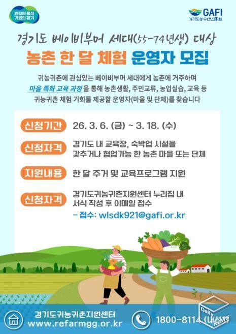 e데일리뉴스 | 경기도와 경기도농수산진흥원은 ‘경기도 베이비부머 농촌 한 달 체험’을 운영할 마을·단체 2곳을 오는 18일까지 모집한다.