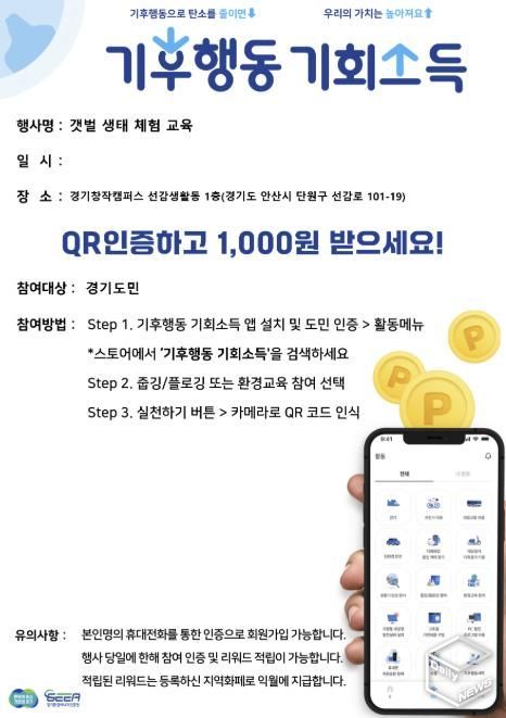 '기후행동 기회소득'은 경기도가 도민과 함께 탄소중립 실천을 위해 경기환경에너지진흥원 주관으로 추진하는 참여형 정책 사업으로 도민들이 전용 어플리케이션을 통해 기후행동 실천 활동을 인증할 경우 연간 최대 1만원 범위 내에서 지역화폐 리워드를 지급받을 수 있도록 구성되어 있다. 경기창작캠퍼스는 경기 서해 바다의 생태 환경을 바탕으로 조성된 체험형 교육 공간인 ‘갯벌놀이터’ 체험 활동을 '기후행동 기회소득' 사업 중 기후행동 실천 활동 환경교육으로 승인받아 운영하게 된다.