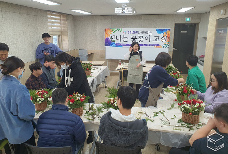 e데일리뉴스 | 24일 오후 3시 부천시 장애인회관에서는 발달장애청소년 10명이 꽃바구니 만드는 방법을 배우는 수업이 한창 진행되고 있었다.