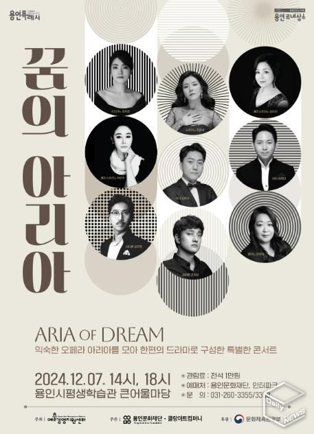이번 주 토요일 12월 7일에 용인시평생학습관 큰어울마당에서는 국내외 각종 오페라 무대에서 주조역으로 맹활약을 펼치고 있는 실력파 성악가들과 연주가가 총출동하여 오페라 콘서트 ‘꿈의 아리아’를 선보인다. 우리 귀에 익숙한 유명 오페라 아리아를 한 편의 드라마처럼 재구성한 작품으로 ‘라트라비아타’, ‘리골레토’, ‘세빌리야의 이발사’등의 아리아를 보다 친숙하고 이해하기 쉽게 감상할 수 있는 좋은 기회가 될 예정이다.
