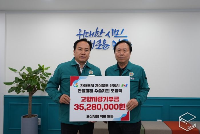 e데일리뉴스 | 오산시 최근 대형 산불로 큰 피해를 본 자매도시 경상북도 안동시의 피해 수습을 위한 고향사랑기부금 3천528만 원을 전달했다.
