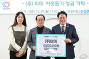 e데일리뉴스 | 안양시는 지난 29일 ㈜미미로부터 이웃돕기 성금 1천만원을 기탁받았다고 30일 밝혔다. 이날 시청 접견실에서 열린 성금 전달식에는 최대호 안양시장과 조인주 ㈜미미 회장, 조예서 전무 등이 참석했다. ㈜미미는 만안구 덕천로에 소재한 기업으로 용역·청소·경비·주택업·건물종합관리 등 다양한 분야에서 사업을 운영하고 있으며, 지역사회 나눔과 사회공헌 활동에도 꾸준히 동참하고 있다. 이번에 기탁된 성금은 안양시 이웃돕기 성금으로 사용되며, 저소득층 건강보험료 지원과 취약계층 물품 지원 등 관내 어려운 이웃을 돕는 데 활용될 예정이다. 조인주 회장은 “지역사회로부터 받은 사랑을 다시 이웃과 나누고자 성금을 기탁하게 됐다”며 “작은 정성이지만 어려운 분들께 도움이 되기를 바란다”고 전했다. 최대호 안양시장은 “연말을 맞아 따뜻한 나눔을 실천해 주셔서 감사드린다”면서 “성금은 저소득층과 취약계층 등 도움이 절실한 이웃들에게 투명하고 공정하게 전달하겠다”고 말했다.