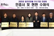 e데일리뉴스 | 용인특례시는 3일 본관 4층 전겹실에서 일자리 창출에 힘쓴 지역 우수기업 8곳에 인증서와 현판을 수여했다. 이번에 선정된 기업은 ▲아산디앤씨 주식회사 ▲일승푸드 제2공장 ▲주식회사 에이치에스씨 ▲㈜인실리코젠 ▲주식회사 홈체크 ▲㈜휴먼인텍 ▲케이제이건설산업(주) ▲트루션 등 총 8개사다. 시는 1차 서류심사와 2차 현장실사를 거쳐 일자리 창출 실적, 고용 안정성, 기업의 성장 가능성, 근로환경 등을 종합적으로 평가해 우수기업을 선정했다. 이들 기업은 최근 1년간 총 74명(기업당 4~19명)을 신규 채용해 지역 내 일자리 창출에 기여했다. 또, 다양한 직원복지제도로 근무하기 좋은 환경을 조성해 일자리의 질을 높이는 데 크게 힘쓴 것으로 평가됐다. 이들 기업에는 인증서와 현판이 수여되며, 시가 주최하는 일자리사업, 기업지원사업 참여 시 가점이 주어진다. 일자리박람회 등 채용 행사에도 우선적으로 참여할 수 있다. 용인특례시 일자리창출 우수기업 인증제는 2018년부터 시행되고 있으며, 매년 고용 확대와 일자리 창출에 기여한 기업을 발굴·지원하고 있다.