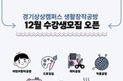 e데일리뉴스 | 경기문화재단 경기상상캠퍼스(대표이사 유정주)는 겨울 시즌 생활창작공방 프로그램 참여자를 오는 17일부터 모집한다. 생활창작공방은 경기상상캠퍼스 생생1990에 위치한 경기생활문화센터 교육 커뮤니티 공간으로, 도민이 일상 속에서 다양한 창작 활동을 경험할 수 있도록 재단공방, 어린이창작공방, 드로잉실, 취미공방, 직물공방, 커피공방, 사진촬영실까지 총 7개의 특화 공간을 운영하고 있다. 11월에는 총 11개의 프로그램이 구성돼 있으며, 주요 프로그램으로는 △Set in wool(울조끼와 가방 만들기), △오롯이 나에게 집중하는 시간: 4주 터프팅 힐링 프로젝트, △내 생애 첫 그림- 알기 쉬운 민화'일월오봉도', △그림책 마음 놀이터 등이 있다. 12월에는 △오일파스텔로 만드는 2026년 달력 △우리들의 예술놀이터, △복을 담는 라탄 복조리 만들기, △복을 쓸어 담는 모시 빗자루 만들기, △커피의 감별과 추출 방법: 커핑까지 총 5개의 프로그램이 운영될 예정이며, 수강 신청은 11월 14일부터 각 프로그램 시작 4일 전까지 경기상상캠퍼스 누리집을 통해 가능하다. 경기상상캠퍼스 내 생활